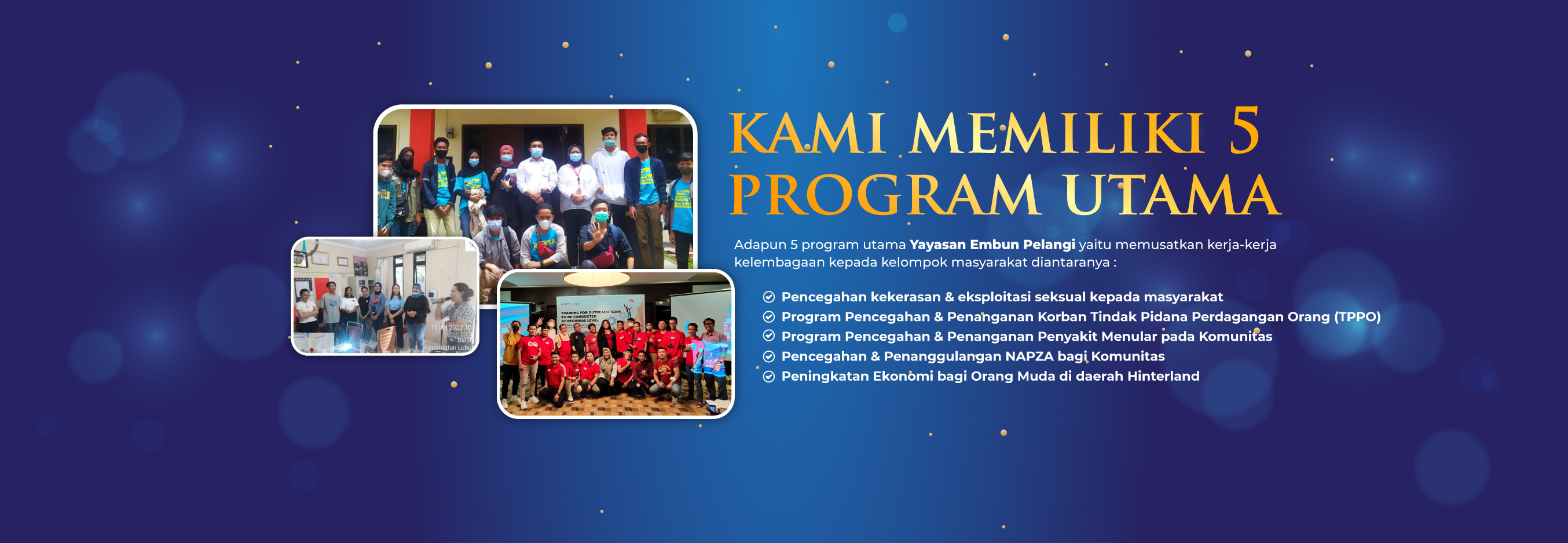 Upaya membangun wadah pencegahan & penangggulangan atas maraknya korban HIV & AIDS di kepulauan RIau, khususnya Batam, menjadi semangat awal berdirinya Yayasan Embun Pelangi. Hingga saat ini, Yayasan Embun Pelangi mencurahkan energi & konsentrasinya diberbagai bidang terkait perlindungan, pendampingan & pemberdayaan komunitas & masyarakat korban HIV dan AIDS